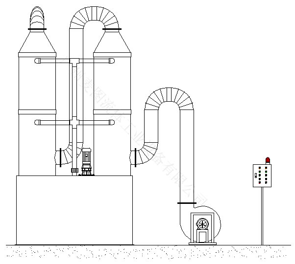 本裝置由單塔或串聯(lián)的雙塔組成,雙塔具有多級(jí)吸收功能,能確保將泄漏出來的氯氣及時(shí)吸收,并進(jìn)行無害化處理。當(dāng)有氯氣泄露時(shí),由于氯氣比空氣的比重大,因而外泄的氯氣總是下沉。從氯瓶中跑出的液氯,流到地面或地溝后迅速氣化,安裝在氯庫的氯氣檢測(cè)報(bào)警儀檢測(cè)到微量氯氣后自動(dòng)報(bào)警,啟動(dòng)漏氯吸收保護(hù)裝置,其引風(fēng)機(jī)通過地面上的引風(fēng)管,把外泄的氯氣抽到反應(yīng)塔進(jìn)行處理。耐腐蝕泵將溶液箱中的溶液送到兩個(gè)反應(yīng)塔。在塔內(nèi),循環(huán)泵產(chǎn)生的高壓反應(yīng)液由噴嘴產(chǎn)生霧化,氣體從第一個(gè)吸收塔由下向上開始升流,與塔頂噴灑下的吸收液在填料中相互接觸。一部分氣被吸收,其余的通過中間管進(jìn)入第二吸收塔,再進(jìn)行第二次吸收。